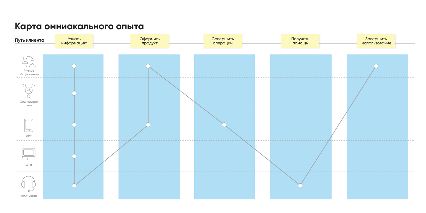 Карта показывает, какие потребности, в каких каналах закрывает клиент. Такая визуализация помогает построить целевой сценарий перехода между разными каналами связи. Например, пользователь узнает о банке через отзыв в соц. сетях у друга, оформляет продукт в офисе, совершает операции в мобильном приложении, консультируется в колл-центре, оставляет отзыв в приложении банка.