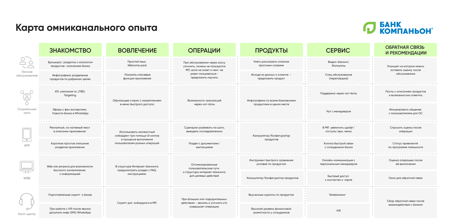Мы изучили пять каналов взаимодействия с клиентами: офис, колл центр, социальные сети, мобильный и интернет-банк. Поняли, какие каналы перегружены, использовали идеи для решения проблемы, которые нагенерировали на предыдущем этапе и составили карту омникального опыта.