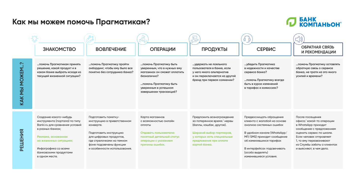 На этом этапе мы смотрели на инсайты, которые описаны в персона-моделях и CJM и задавали вопросы: Как мы можем помочь?
