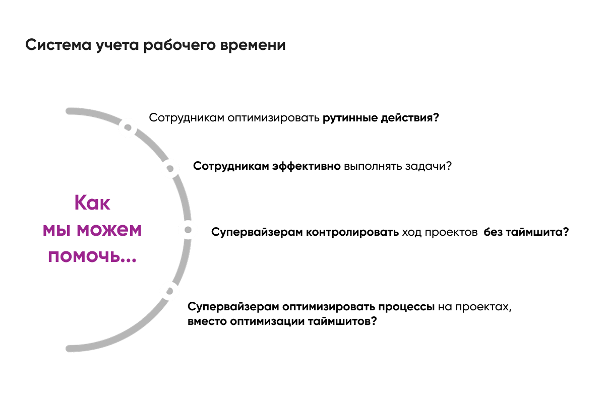 Мы предложили сделать прозрачную и эффективную систему учета, которая будет мотивировать сотрудников использовать рабочее время с максимальной отдачей. Чтобы придумать решение, мы использовали метод — «Как мы можем помочь».